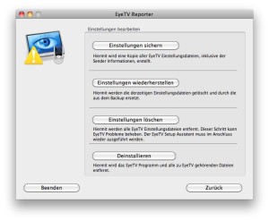 Der EyeTV Reporter ist ein kostenloses Tool das verschiedene Troubleshooting Optionen für EyeTV anbietet.